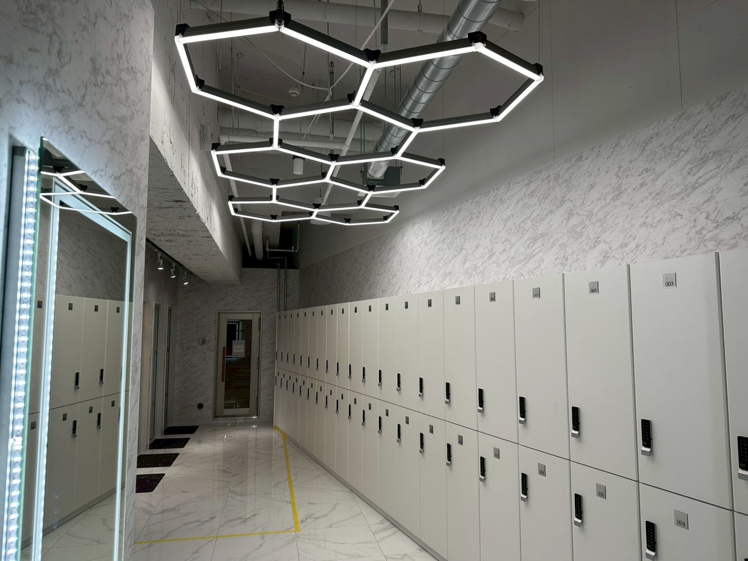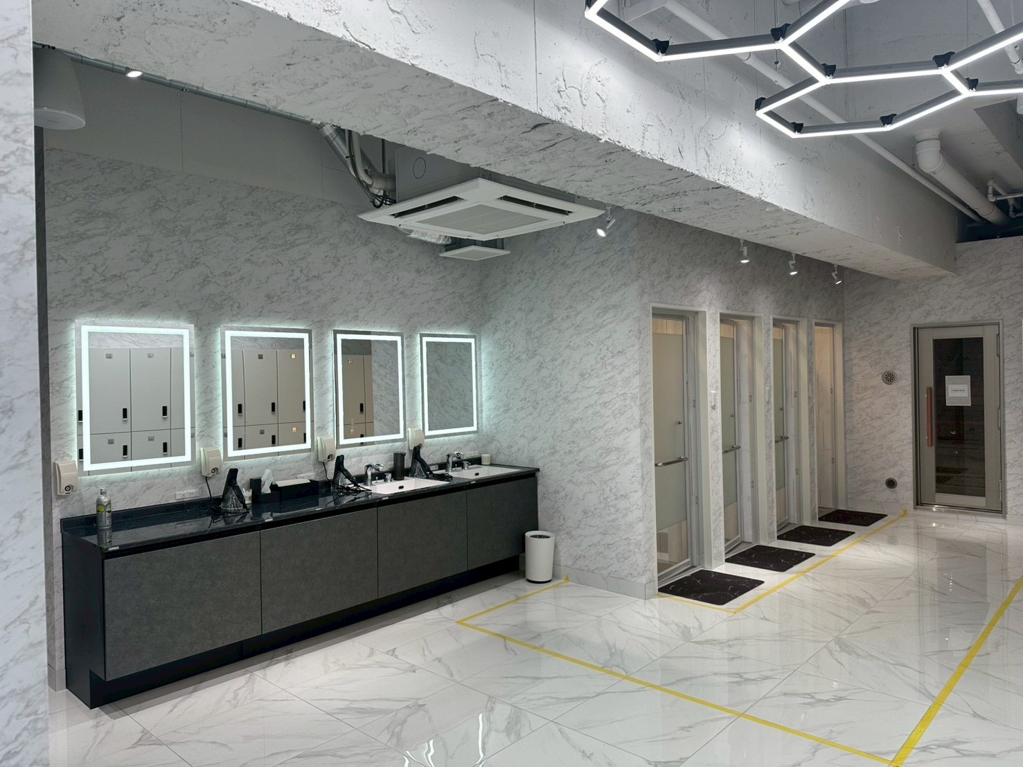 さらに、更衣室やパウダールームも充実。明るい照明付きの鏡と綺麗なドレッサーを揃えており、トレーニング後のお直しもスムーズです。
