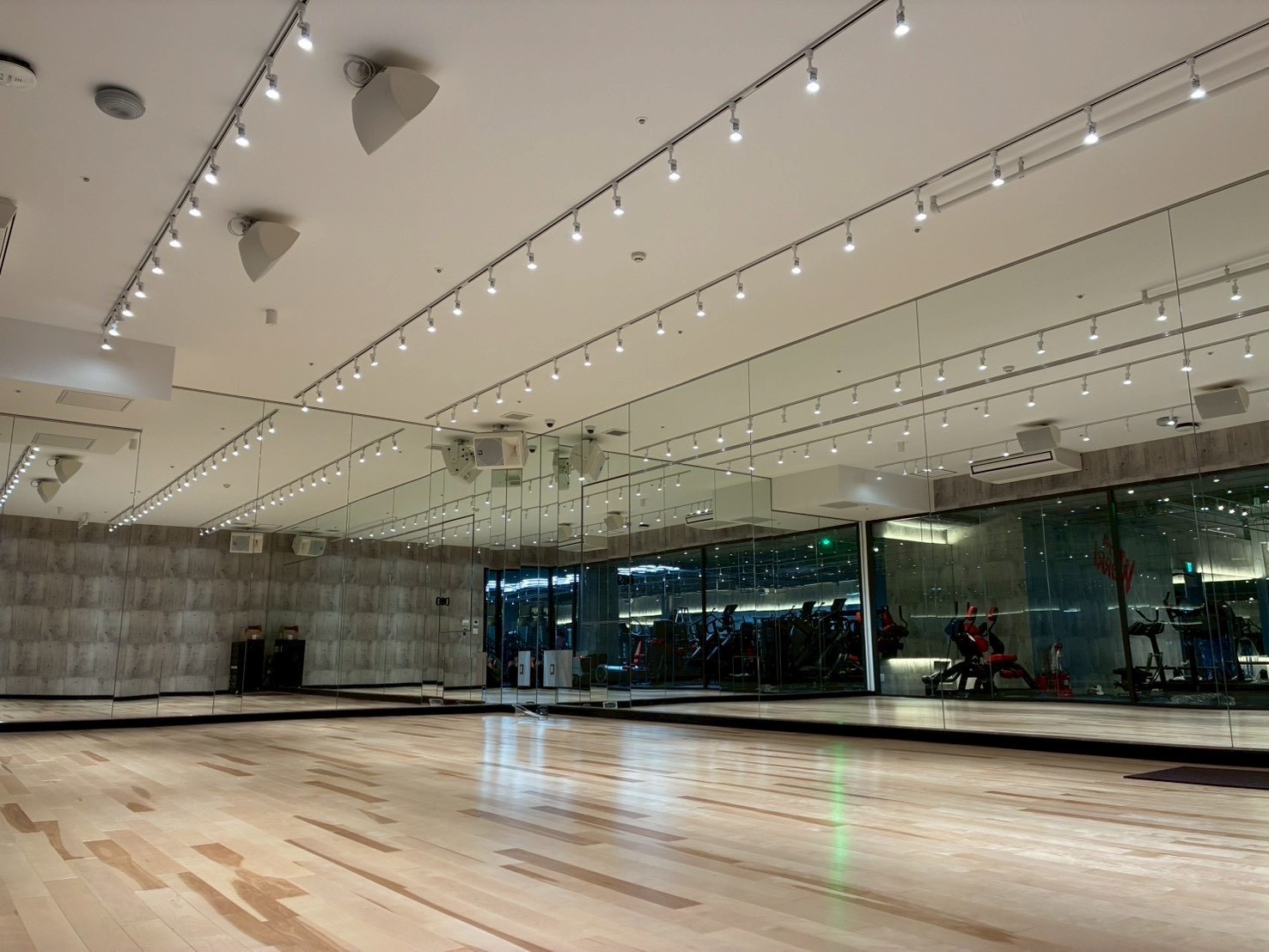 自由な使い方ができるスタジオエリアは、壁一面の大きな鏡で、ピラティスでのコンディショニング(近日導入予定)や、日々の体の変化を確認するのに最適です。